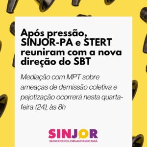 Os Sindicatos de Jornalistas do Pará (SINJOR-PA) e dos Trabalhadores das Empresas de Rádio e Televisão do Pará (STERT-PA) se reuniram nesta segunda-feira (22) com representantes da TV SBT Belém